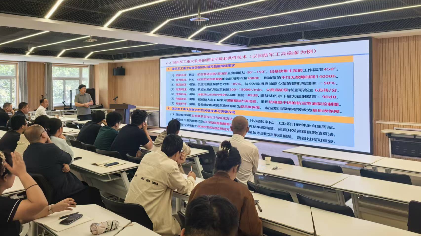 活动邀请我校黎义斌教授做特邀报告。黎教授在高端流体工程装备领域具有深厚理论研究基础并实现广泛技术应用,是我校军工科研和产学研用有效结合的典范。围绕国防军工,黎教授以军工科研经历的“反向应用研究-基础理论研究-正向应用研究”阶段引出军工技术从“-1-0-1-N”的发展历程,以“理论-模型-算法-应用装备”四部曲讲到军工科研的基本研发思路。他谈到,拥有“研究平台、体系、方向、实验平台”等强有力科研基础以及硬核科研能力的重要性,进而鼓励广大青年教师勇于“走出去”“深交流”“敢于做”,多方寻求合作机会,产学研用互促发展相得益彰,形成良性循环模式,不断壮大我校科学研发实力。