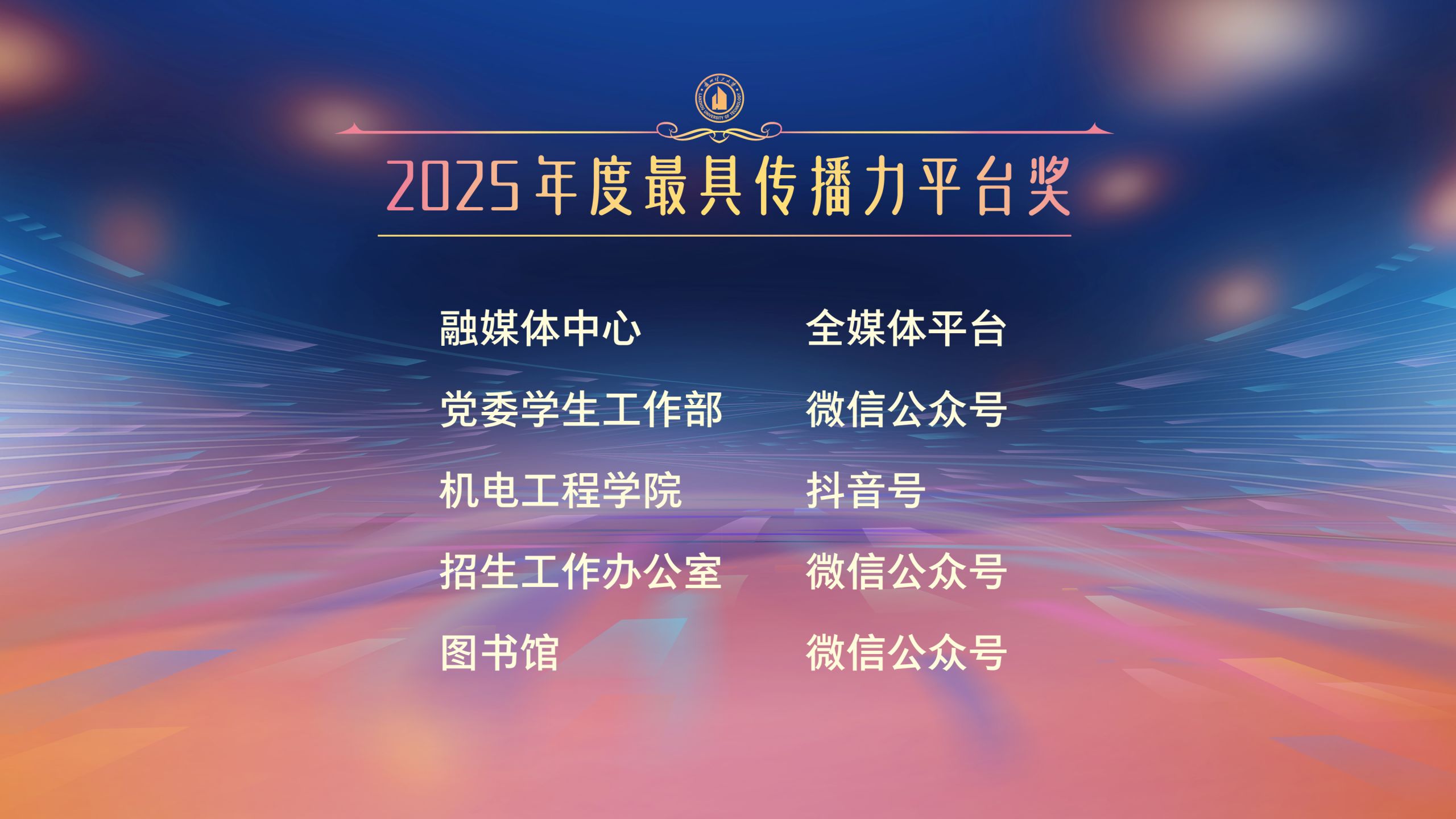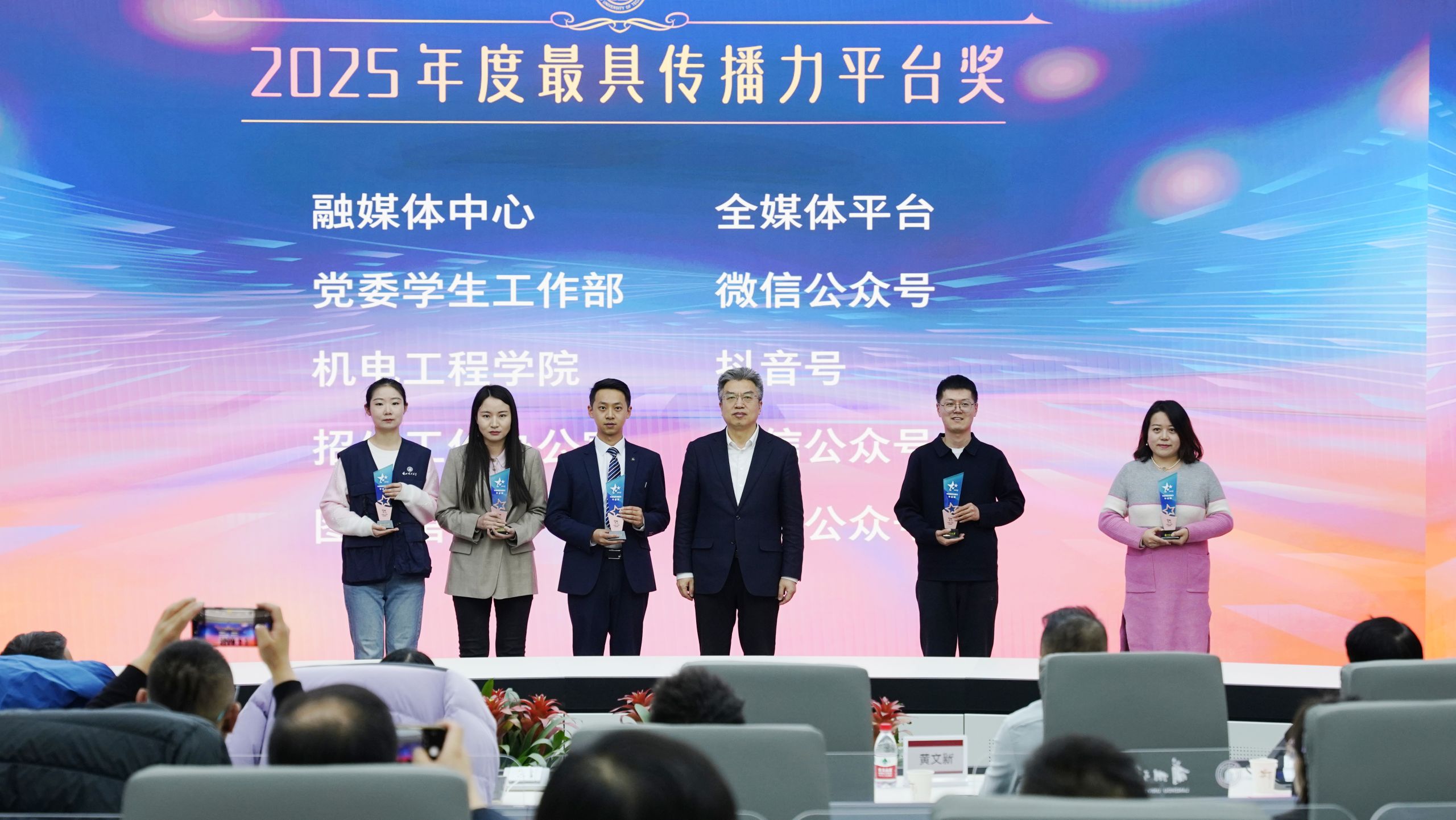颁奖环节,冀宏为融媒体中心全媒体平台、党委学生工作部微信公众号、机电工程学院官方抖音、招生工作办公室微信公众号、图书馆微信公众号5个获得2025年“最具传播力”的平台颁奖。