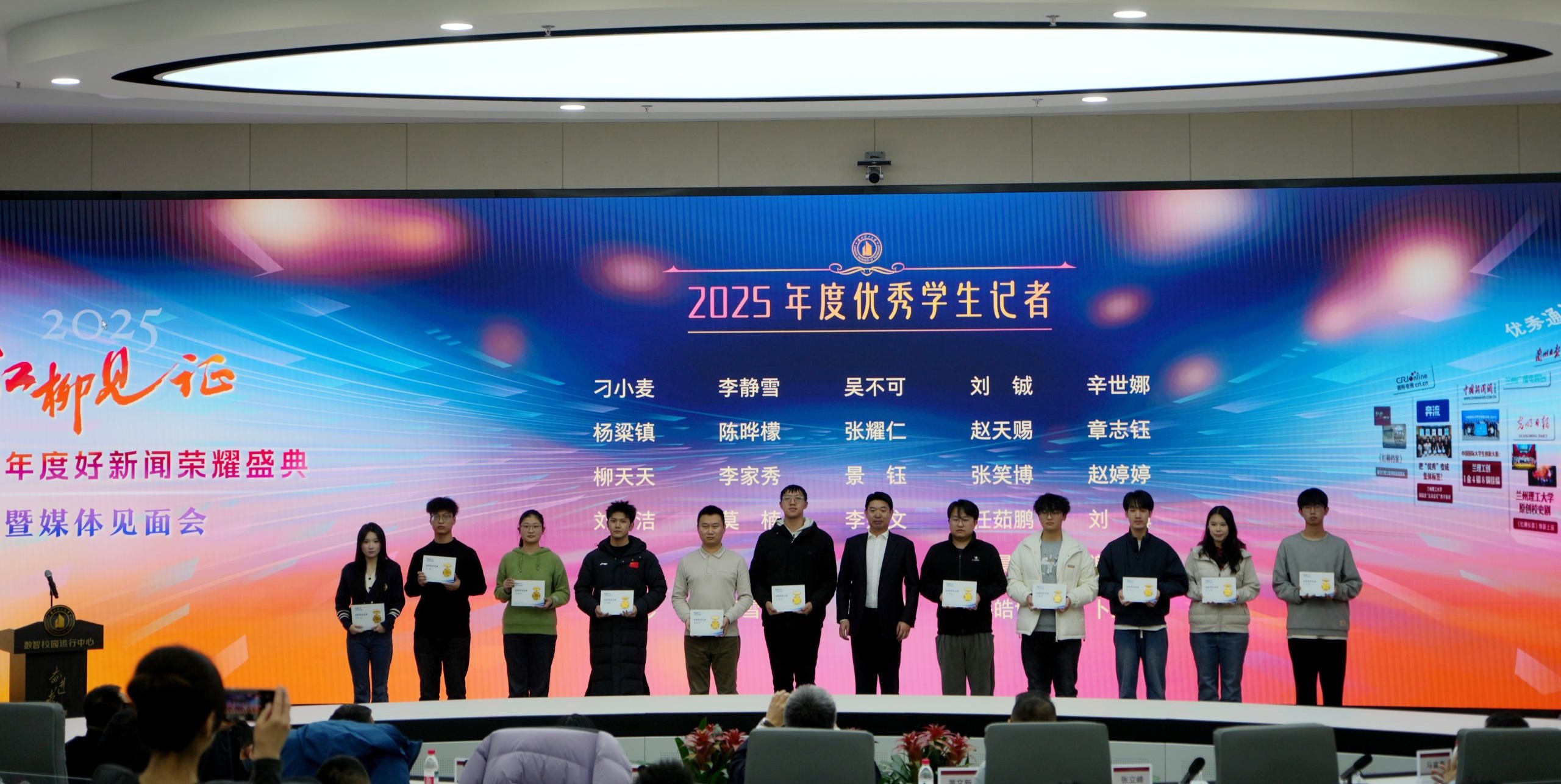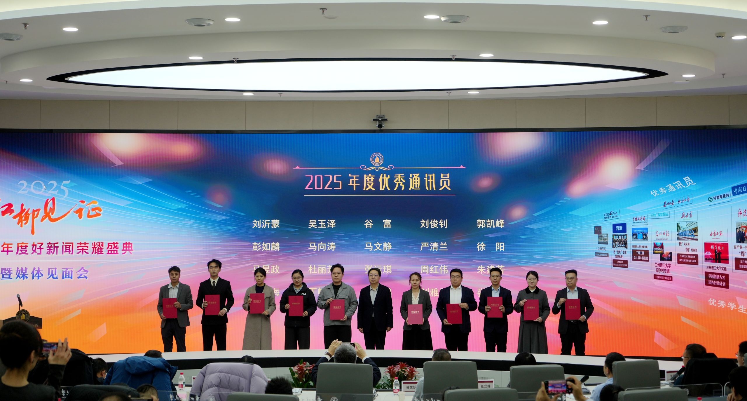12月30日下午,雷竞技qg兰工坪校区数智校园运行中心暖意融融、气氛热烈,2025年度兰理工好新闻系列奖项表彰会暨媒体见面会在此举行。学校党委副书记、校长冀宏,党委常委、副校长张立峰,人民日报、新华社、中央广播电视总台、光明日报、科技日报、中国新闻社、中国青年报、中国教育报、中国社会科学报、中国科学报等中央驻甘媒体负责人,甘肃日报、甘肃省广播电视总台、兰州日报、兰州广播电视台等省市级媒体记者,学校相关部门负责人、各学院负责人和获奖代表齐聚一堂,共叙校媒情谊,共商融合发展。会议由党委常委、副校长吕文英主持。