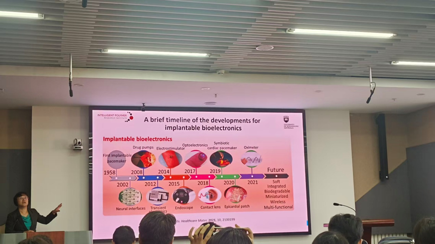 王彩云教授以“导电聚合物工程在能源领域的应用”为题,结合团队的研究成果,介绍了导电聚合物的混合电子-离子导电性、柔韧性、生物相容性等特性,系统讲述了其在能量存储、生物集成电池、不对称膜、CO2电还原等领域的广泛应用,并重点解析了其作用机制、材料设计原理及在细胞相关研究中的潜在应用价值。该报告深入到导电聚合物的研究前沿,拓展了该材料在高性能设计、多功能集成、绿色制造等方面的应用,为师生打破专业壁垒,构建交叉学科的创新研究注入了新思路。