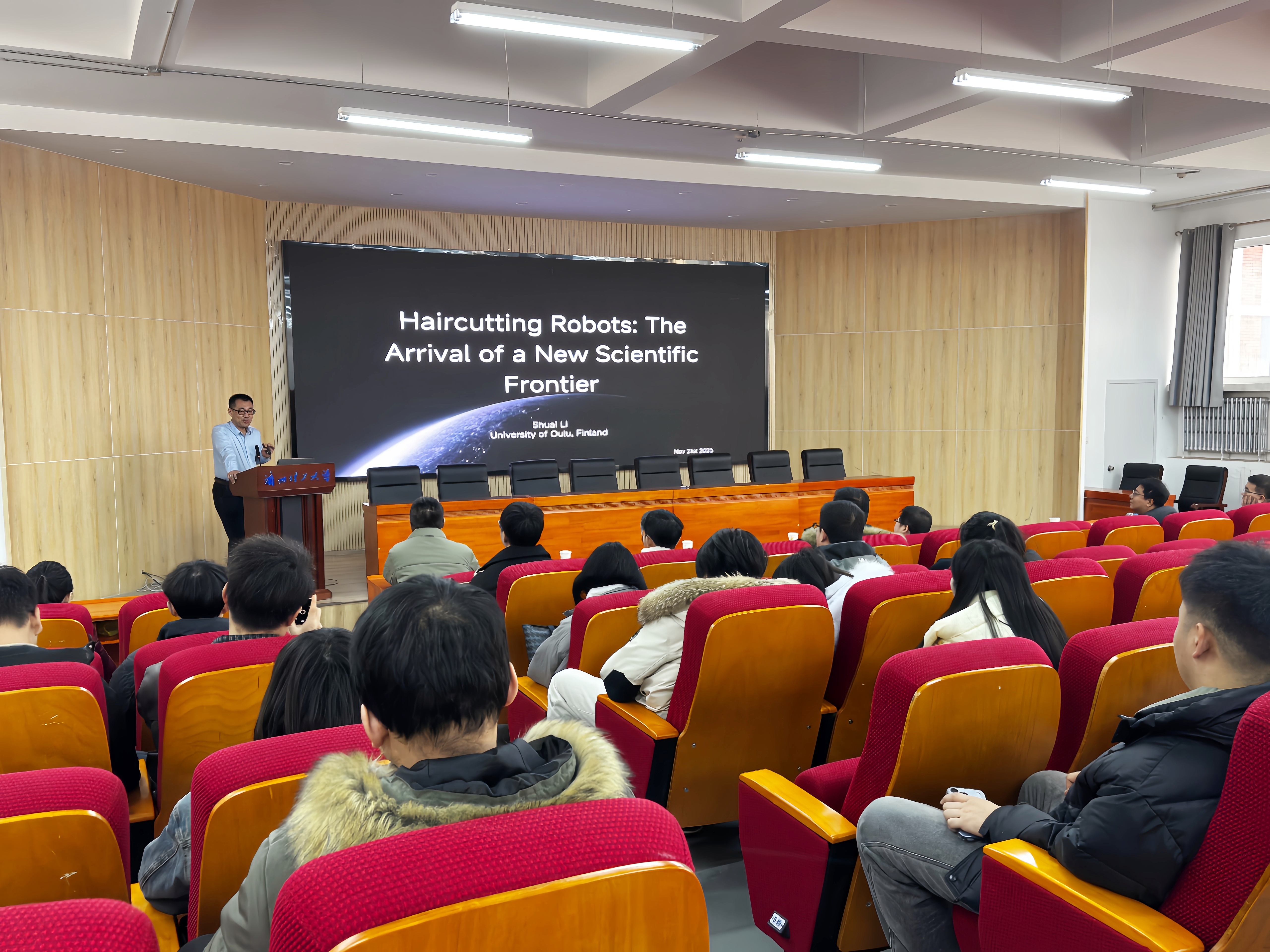 安孝晟以“矩阵加权图:一致性视角下的连通性”为题,深入阐述矩阵加权图如何刻画无向图与有向图的动态行为特性,重点探讨当边的权重为正定矩阵时,顶点之间的连接问题,为复杂网络分析提供了新的理论视角。李帅以“理发机器人:一个新的工程领域”为题,分享了其团队在理发机器人领域的最新研究进展,融合机器人技术、人工智能和美学设计等多学科知识,以应对精度、安全性和定制化等实际挑战。