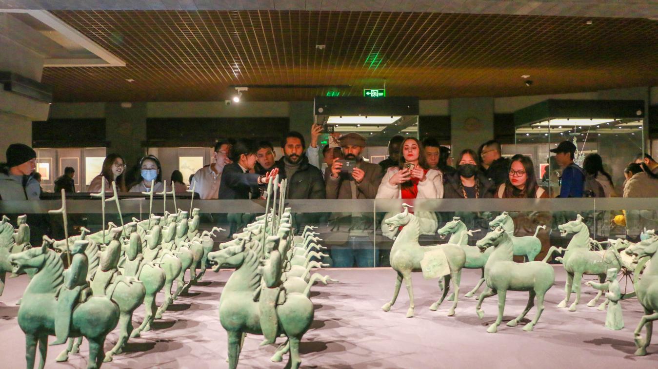 在博物馆讲解员带领下,学生们循着历史脉络沉浸式参观。“甘肃彩陶” 展厅中,5500 年前的人头形器口彩陶瓶让来自巴基斯坦安妮惊叹:“史前先民的技艺堪称艺术奇迹!”“丝绸之路文明” 展厅内,铜奔马三足腾空的灵动姿态震撼全场,来自阿富汗的奕辰感慨:“亲眼见到铜奔马,才懂古代工匠的智慧。”