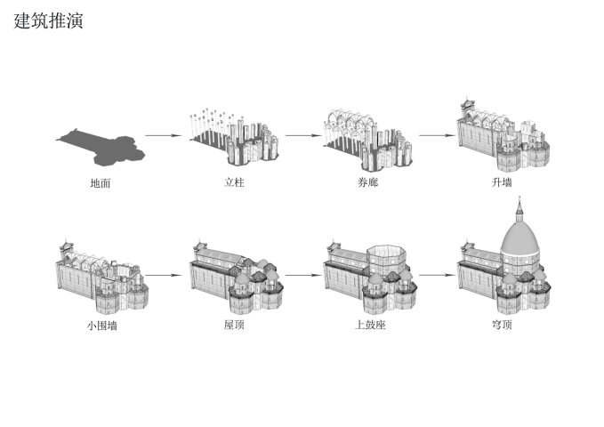 《外国建筑史》课程教学中涵盖了大量外国古代经典建筑,如古希腊的雅典卫城,古罗马的万神庙、斗兽场,中世纪的巴黎圣母院、科隆主教堂,文艺复兴的圣马可广场、圣彼得大教堂等,对这些建筑的学习由于先天隔阂和以往仅依靠学生的想象力,很大程度上增加了学生认知的难度。同时以往注重学生知识普及学习,致使学生的主动思考、批判能力不足。经典建筑图解是从微观探究建筑,以实现对建筑现象的理解与把握。同时它也是一种抽象化思维的体现,以图示语言揭示建筑本质的过程。一个经典建筑的解析需要从不同视角对建筑层层剥离,拆解后的每一个形式元素即可呈现出建筑的深层逻辑与建筑意义。